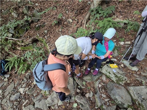 송주희 소방교가 어지럼증 호소 등산객을 응급조치하는 모습. 충남소방본부 제공 |